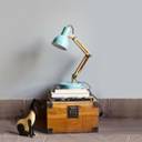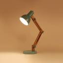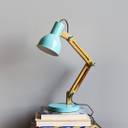 This study table lamp has traditional shape with adjustable wooden sconces in sea blue finish used to pivot direct light where it's needed, toward reading, sewing or mood creation.