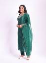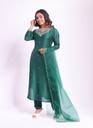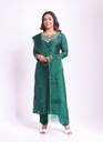 Featuring a bottle green kurta in dola silk base with moti , katdana & dabka work. It is paired with matching pants and emboidered dupatta.