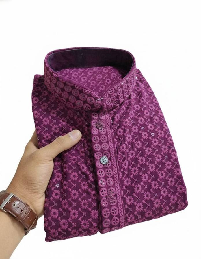 Features a structured Mandarin collar and a hidden button placket for a clean, seamless look. Subtle tonal embroidery on the chest adds a touch of luxury without being over-the-top