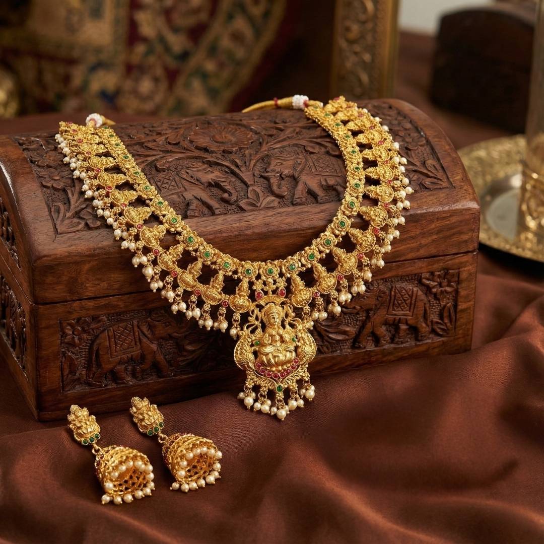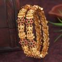 These South Indian traditional gold-plated bangles are inspired by intricate temple architecture and classic motifs. Made from high-quality metal with durable gold plating, they are designed to last and shine. Perfectly paired with a saree, lehenga, or salwar suit, this set radiates classic South Indian elegance. Ideal for weddings, festivals, and special occasions, these bangles add a touch of heritage charm to any outfit.