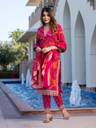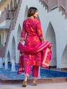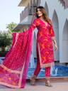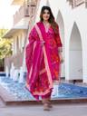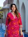 Orni Fashion Pink Bandhej Print Straight Kurta Set in pure cotton features embroidered bandhani prints, a shirt collar, and three-quarter sleeves. With side slits, printed trousers, and a matching dupatta, it’s perfect for festive occasions