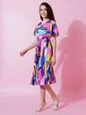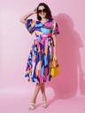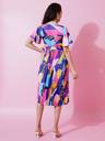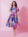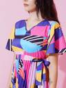 Polished Elegance: V-Neck Belted Pleated Dress with Printed Top in Polyester Fabric, Fit and Flare Design, Elastic Waist, Hemline Detail, and Stylish Pleated Skirt with Waist Belt.