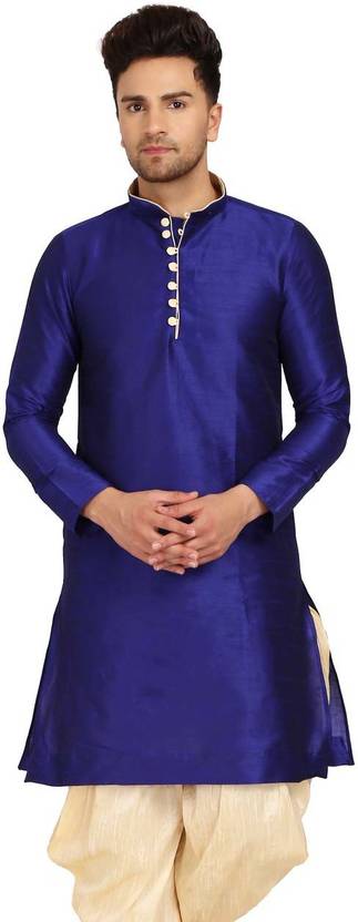 Over Crowd Men Solid Art Silk Straight Kurta (Blue)