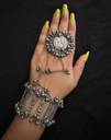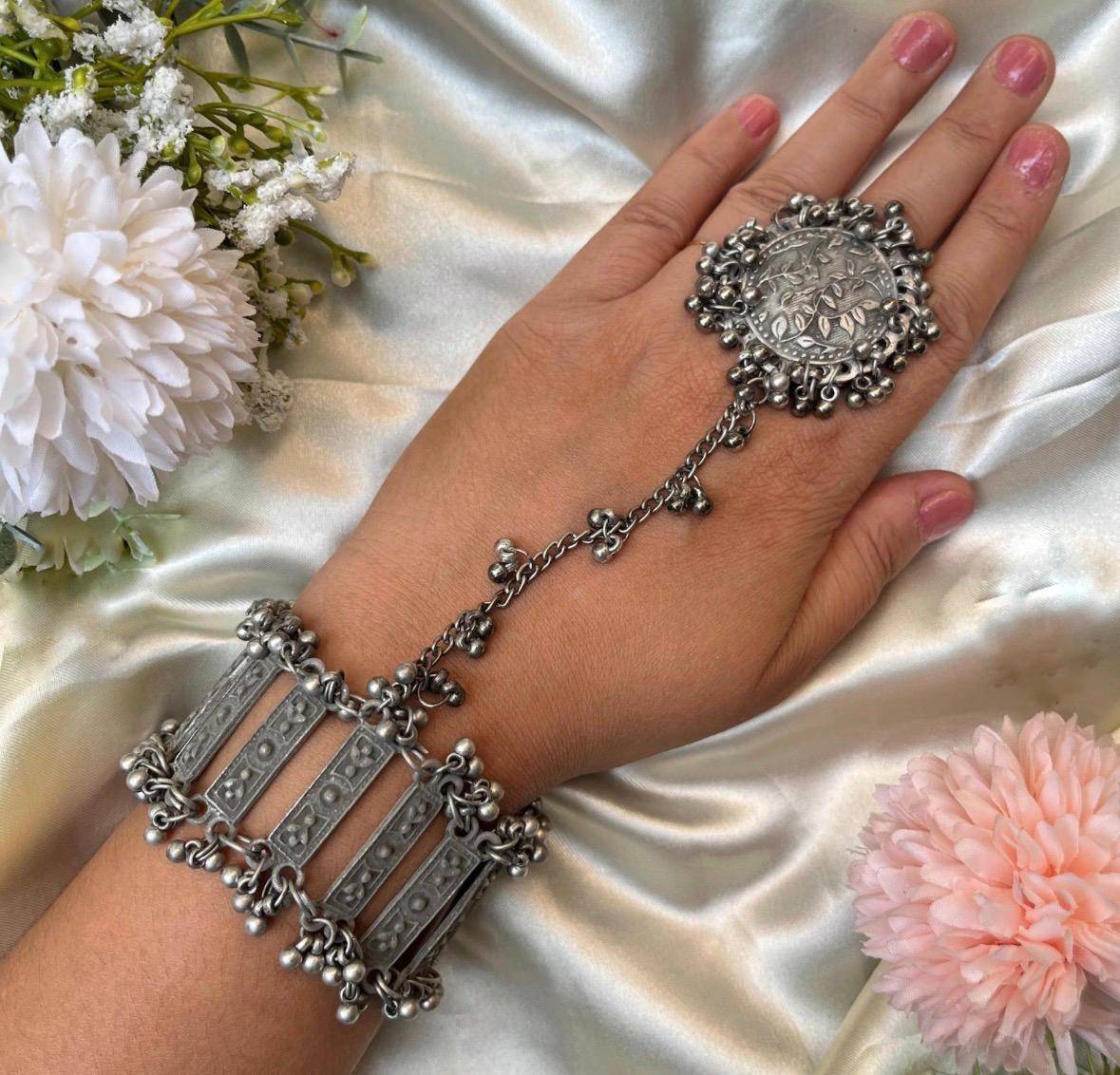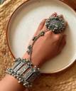this elegant silver traditional oxidised hand cuff bracelet with an attached ring is a beautiful blend of classic design and contemporary style. crafted with intricate detailing, it adds a touch of ethnic charm to your look. perfect for weddings, festive occasions, or traditional events, this bracelet-ring combo complements both indian and fusion outfits. made with durable, skin-friendly metal, it offers comfort and style in one stunning accessory.