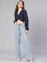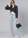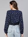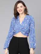Make the hottest fashion move by wearing this Hot bleek navy blue floral print gathered pleated women's crop top that is enriched in a great fit, quality, and stunning look. It features floral print all over, a v-neckline, long extended sleeves, a gathered style in front to perk up the look, a round hem, and crop length. For a cool vacation look to any casual look picking this top to wear will do justice to your personality surely. Style it with nice-looking bottom wear to catch the finest look