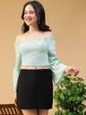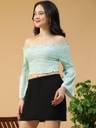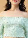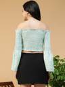 Women Light Green Dot Print Long Bell Sleeve Off-Shoulder Smocking Crop Top