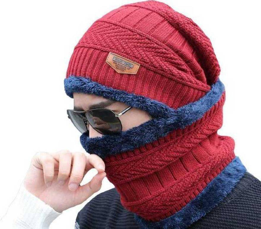Self Design Red Bennie Cap & Scarf Snow-Proof (Inside Fur) Woollen Beanie Cap with Warm Winter Scarf For Men & Boy Cap