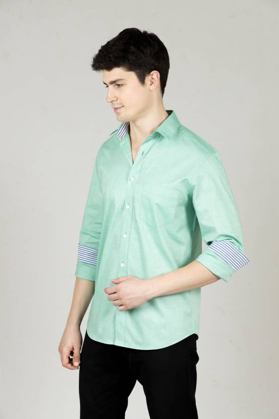Feel the quality of this classic Green Oxford Men's Cotton F/S Shirt! The custom fit and button down collar give you a formal look, while the striped trim fabric inner cuff and inner collar band add a touch of style. Crafted from 100% cotton yarn dyed Oxford fabric, this full-sleeved shirt with single pocket is the ideal finishing touch to any ensemble. Make a statement with this must-have shirt!