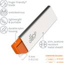 10585 Manual Carton Cutter is a clever addition to our line of safety knives. As the name suggests, this tool design—its exposed blade length and angle—is ideal for boxboard and thin corrugate. The Slice carton cutter (manual) has just enough blade exposure to easily cut through boxboard without fear of damaging package contents. Slide the tool’s protective metal sheath to cover or uncover the blade as needed. The 10585 ships with a rounded-tip 10526 utility knife blade. As with all Slice tools, the blade features our finger-friendly® edge, is chemically inert, never rusts, and lasts up to 11 times longer than a comparable metal blade.