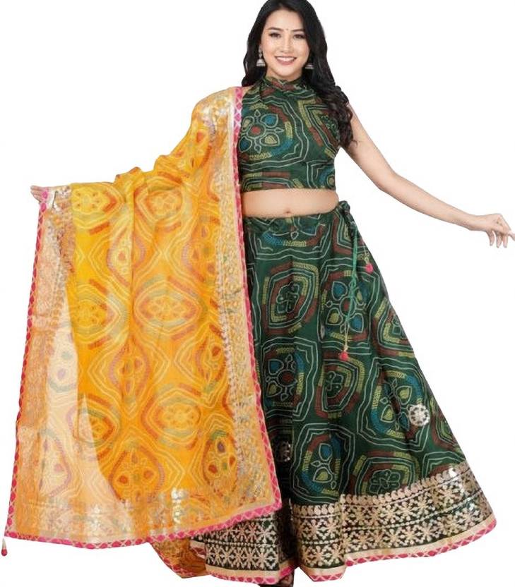 Bandhani Print Stitched Kota Doria Gota Patti Work Traditional Ethnic Lehenga Choli with Dupatta Set with Unstitched Running Blouse. 1 Ready Lehenga, 1 Dupatta, 1 Running Blouse ( Unstitched ) Length of Lehenga- 42 Inch , Waist of Lehenga - 44 Inch. Full stitched lehenga with full touch astar ( Lining ), Dupatta- Kota Doria fabric and Length 2.25 meter, Blouse Fabric : 80cm running blouse with Gota Work. Wash Care Instructions: Please Dry Clean Only., Fit Type- With dori.Kota Doria fabric Bandhej lehenga With lining, Flair : approx. 4 Mtr lehenga, 1 Ready Lehenga with Dupatta and Running Blouse, Trendy Ethnic Beautiful Jaipuri Handmade Gotapatti Lace Border Work Lehenga Choli Set with Dupatta.Trendy Ethnic Beautiful Jaipuri self-design Gotapatti Lace Border Work Lehenga Choli Set with Dupatta. It's perfect for wedding , festival and other ethnic occasion.