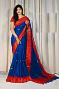 Beautiful embroidered Paithani cotton silk saree in a stunning magenta and light green combination. Features traditional zari woven borders with peacock and lotus motifs, adding a royal touch. Comes with a matching blouse piece. Ideal for weddings, festive functions, and cultural events, offering a luxurious ethnic look with lightweight comfort