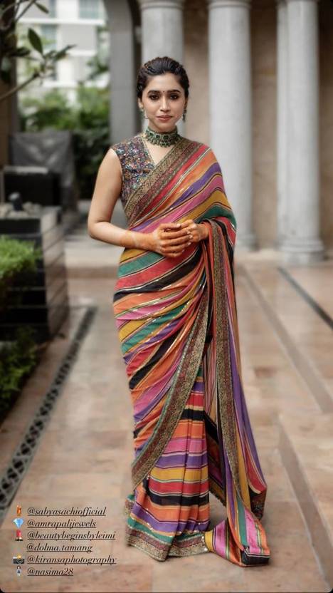 Floral printed saree The saree comes with an unstitched blouse piece The model is wearing a stitched version of the blouse piece. The saree comes with an unstitched blouse piece