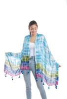 Adding a charming detail to the scarves, multi-coloured tassels adorn both shorter edges, creating a playful and bohemian-inspired finish. These tassels not only contribute to the overall aesthetic appeal but also provide a touch of movement and texture. The varied colours in the tassels enhance the scarf's versatility, allowing for easy pairing with different outfits.
