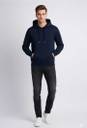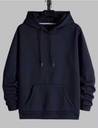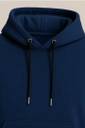 There is a large kangaroo pocket on the front, where the model's right hand is placed.