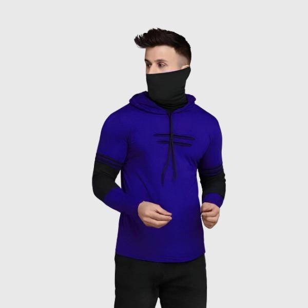 It has an attached hood with adjustable drawstring cords. The cords are black with contrasting silver/white tips (aglets).
