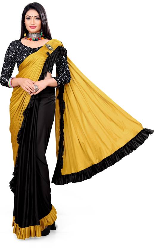 Explore the collection of beautifully designed Saree from Panetar Sarees. Each piece is elegantly crafted and will surely add to your wardrobe Gracefully woven by skilled artisans using high-quality threads and this saree makes a perfect addition to the wardrobe for all occasions. The simple yet stylish Stitched Saree with Ruffle designs, is elegantly Made of Solid Lycra Blend Fabric. Pair this piece with heels or flats for a graceful look. Fabric - Lycra Blend Blouse- Unstitched (0.8 m) .