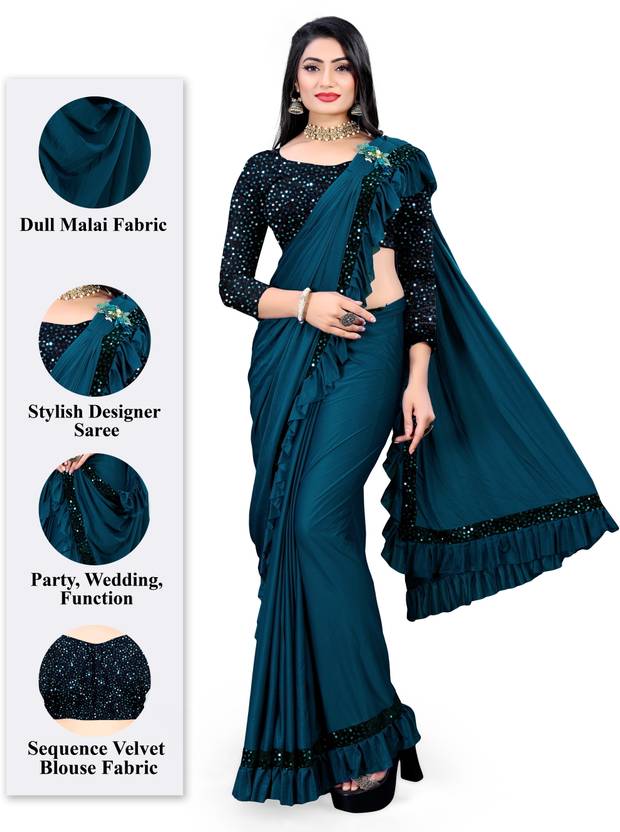 PANETAR Solid/Plain Bollywood Lycra Blend Saree (Light Blue)