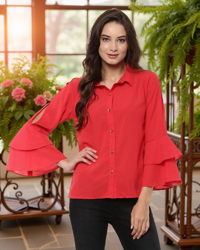 PANNKH Casual Slit Sleeve, Layered Sleeve Solid Women Red Top