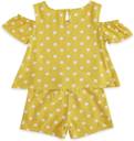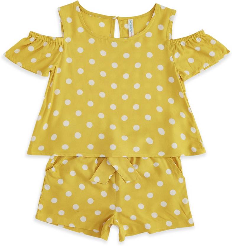 Add a charming look to your kid's style by adding this cute coordinate set to their wardrobe. The top has a round neckline with a back opening and fancy cold shoulders. The shorts feature an elasticated waistband with a tie-up, cross pockets and a comfy silhouette. Both exhibits an adorable polka dots print on the body for a stylish look, this set is crafted from a soft quality fabric that will deliver great comfort to your kid and elevate their style.