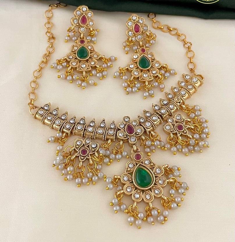 PEARL DETAILS: Elegant pearl drop attachments enhance the traditional appeal, creating a graceful cascading effect on both necklace and earrings