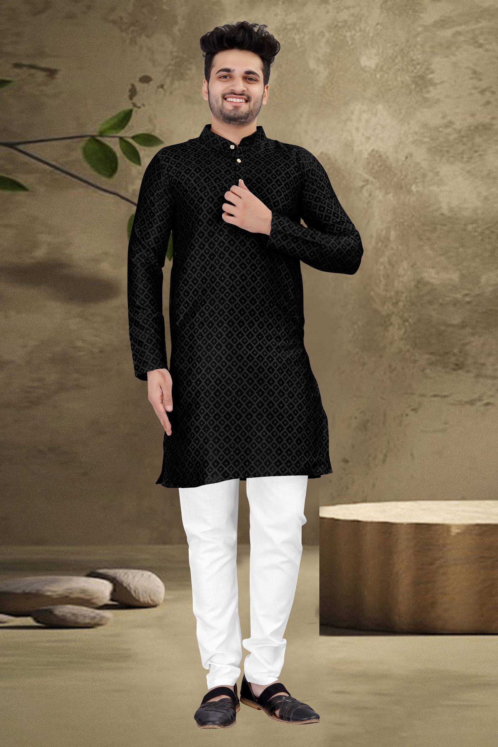 Boasting a distinctive and elaborate diamond pattern, the kurta adds a sense of structured sophistication to this overall outfit. The repeated diamond-shaped motifs offer visual interest without overwhelming the style. Moreover, paired with solid-patterned pyjamas, this set provides a balanced and coordinated appearance.