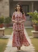 Brighten up any day with the delightful floral print featured on this kurta sharara set. The multicolour pattern adds a lively touch, making it perfect for both festive gatherings and casual outings. Its vibrant hues are sure to draw compliments, bringing cheerful elegance to your wardrobe every time you wear it.