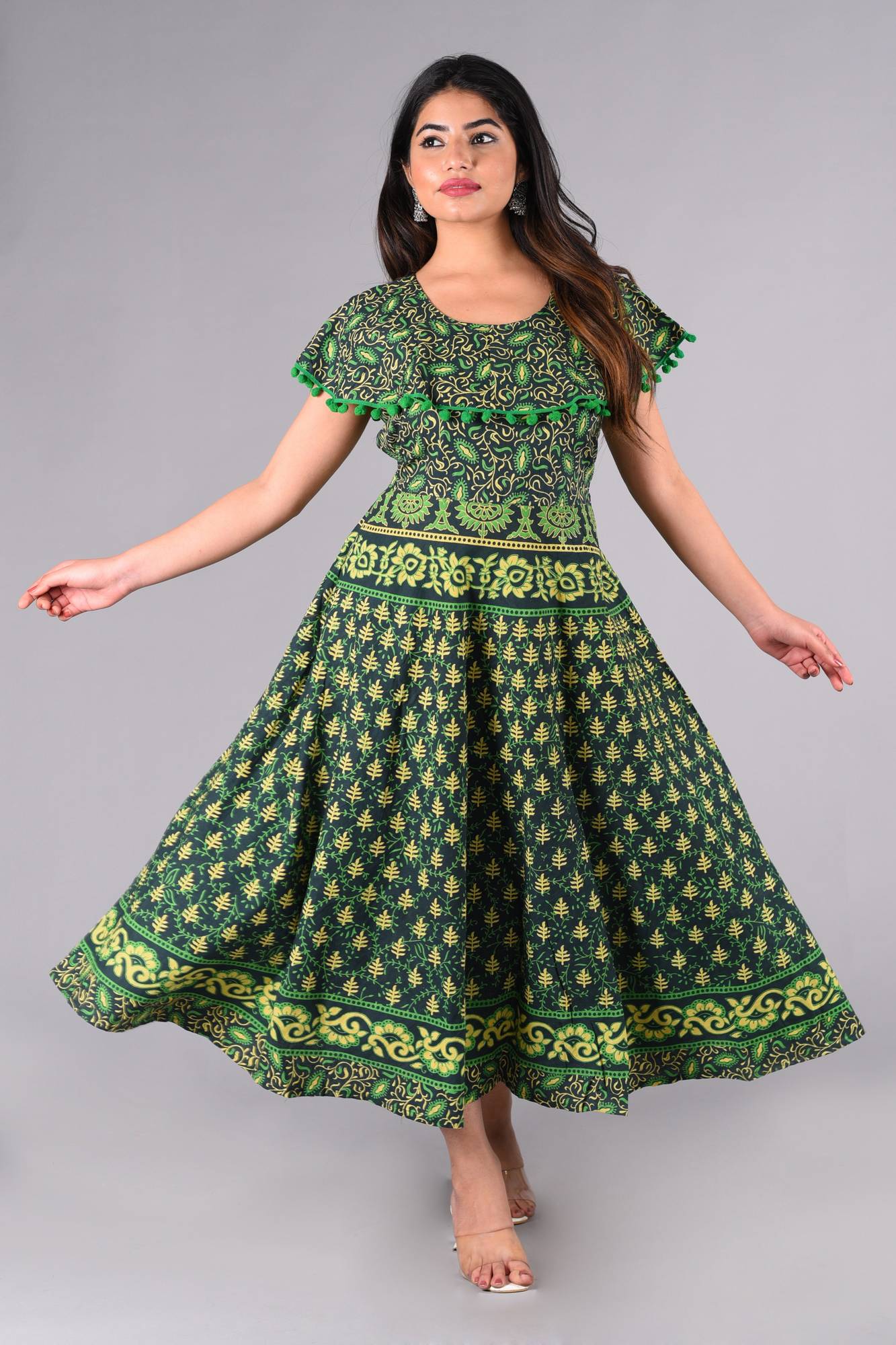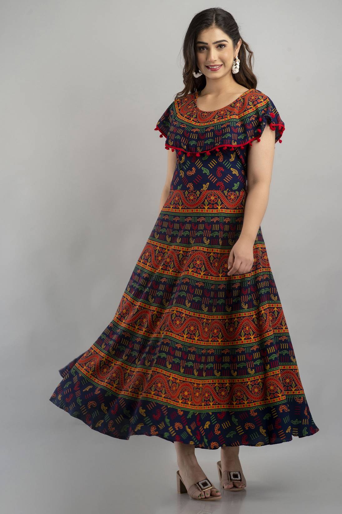 This Cotton Long Gown Dress Embellished With POM POM at Yoke design. It's Free Size, fits upto 44 Inch Bust Size, Length - 49 Inch.