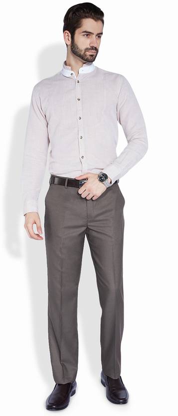 Complement your professional look wearing these stylish medium khaki color trousers by Park Avenue. Crafted from rayon, these slim-fit trousers features flat front, cross pockets and pointed belt extensions. Pair it with a formal shirt, leather belt and polished shoes for a smart look.