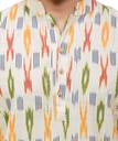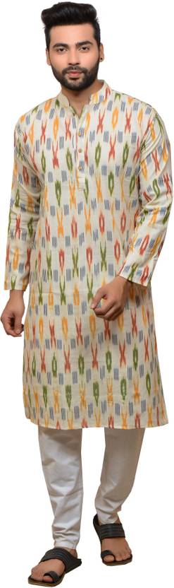 Get the offwhite casual ethnic long kurta for this festive season made from best quality Pure Cotton handloom ikat selfdesigned fabric. Chinese/mandarin collar makes it more classy with front buttons & regular sleeves. One can use it for festive attire or for a casual traditional outing or for festivals like rakhi, navratri, diwali, muharram, eid, holi or for some puja. This long kurta can be paired with loose bottoms or jeans for yoga & exercises.