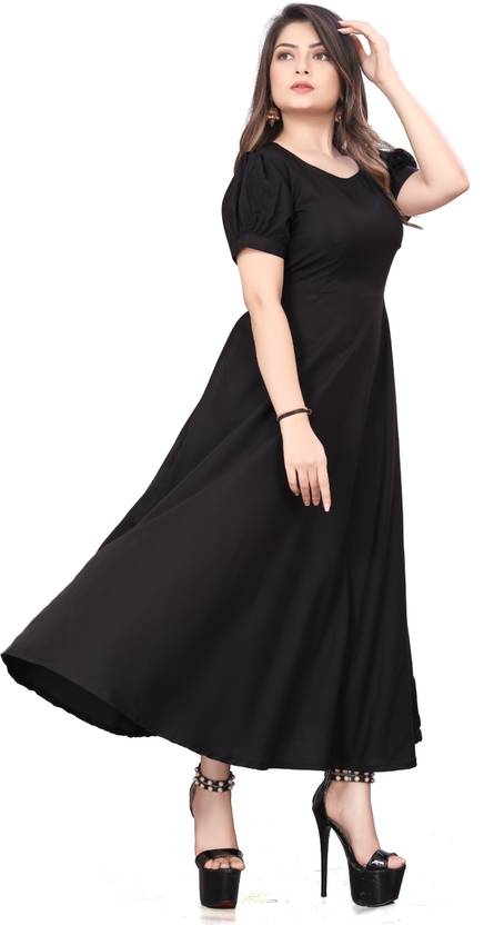 Name : Women A-Line Dress Color Black Dyed/ Washed Puffed Sleeve Maxi Dress