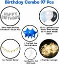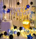 30 pieces of light blue latex, 30 pieces of white metallic, 30 pieces of black metallic, 2 pieces of dark blue star foil, 2 pieces of fairy led light, 1 piece of silver happy birthday foil balloon, 1 piece of pennant banner,