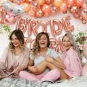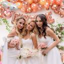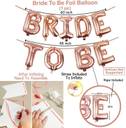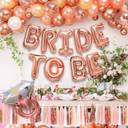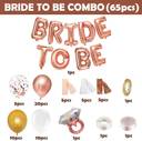 20 rose gold balloons, 10 golden balloons, 10 white balloons, 1 ring foil balloon, 5 pieces of rose gold confetti, 5 pieces of pink, 5 pieces of white, 5 pieces of rose gold tassels, 1 glue dot roll, 1 balloon arch, and 1 piece of ribbon make up one set of "Bride to Be" letter foil balloons.