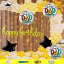 gold 16 inch cursive letter alphabet foil ballon, thankyou dad printed foil ballon, golden star 10 inch foil ballon, silver star 10 inch foil ballon, blue air hand balloon pump, balloon arch strip, glue dot, golden confetti balloon, white yellow metalic balloon with curling ribbon, yellow pastel balloon, golden curtain or net, golden fairy light