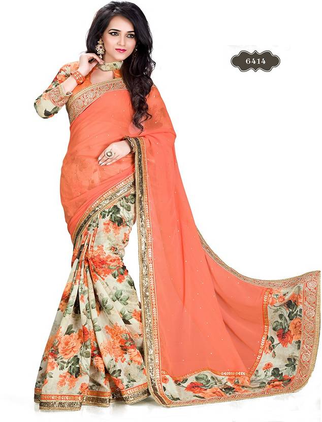 Parvati Fabrics Embroidered Bollywood Cotton Blend Saree (Orange, Beige)