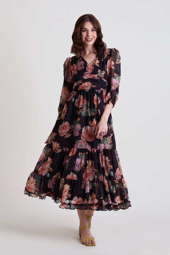 Be the centre of attention with this dress. The sleeveless piece has a boat neckline with a detailed back and a tiered bottom. The dress has an impeccable all-over floral print and is constructed from premium chiffon fabric for a flattering look and excellent ventilation.