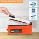 Boasting an AC power source, this sealer consumes up to 300 W with a requirement of up to 200 W and operates at up to 220 V. It offers a sealer length of up to 200 mm and a seal thickness of up to 2 mm, suitable for a range of bag sizes. The temperature reaches up to 8 K, assisted by rubber and silicon strips that enhance sealing efficiency. Furthermore, the indicator light automatically turns on when the handle is pressed, offering clarity during operation.