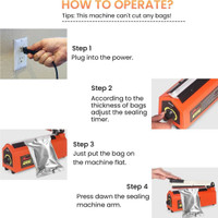 Featuring a hand-held design, this heat sealer works with impulse power of up to 410 W and is operated manually for straightforward use. The integrated cutter provides neat finishing after sealing, making the process convenient. The operation involves four simple steps. First plug this sealer into the power source, adjust the sealing timer according to the thickness of the bag, place the bag flat on this sealer and press down the sealing arm to complete the seal.