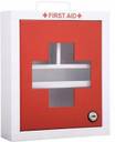 The cabinet features a wall-mountable design, a top handle for portability, and a lock with key for safety. The red and white finish with a cross cut-out window ensures quick identification in emergencies. Ideal for storing medicines, bandages, antiseptics, and other first aid essentials.