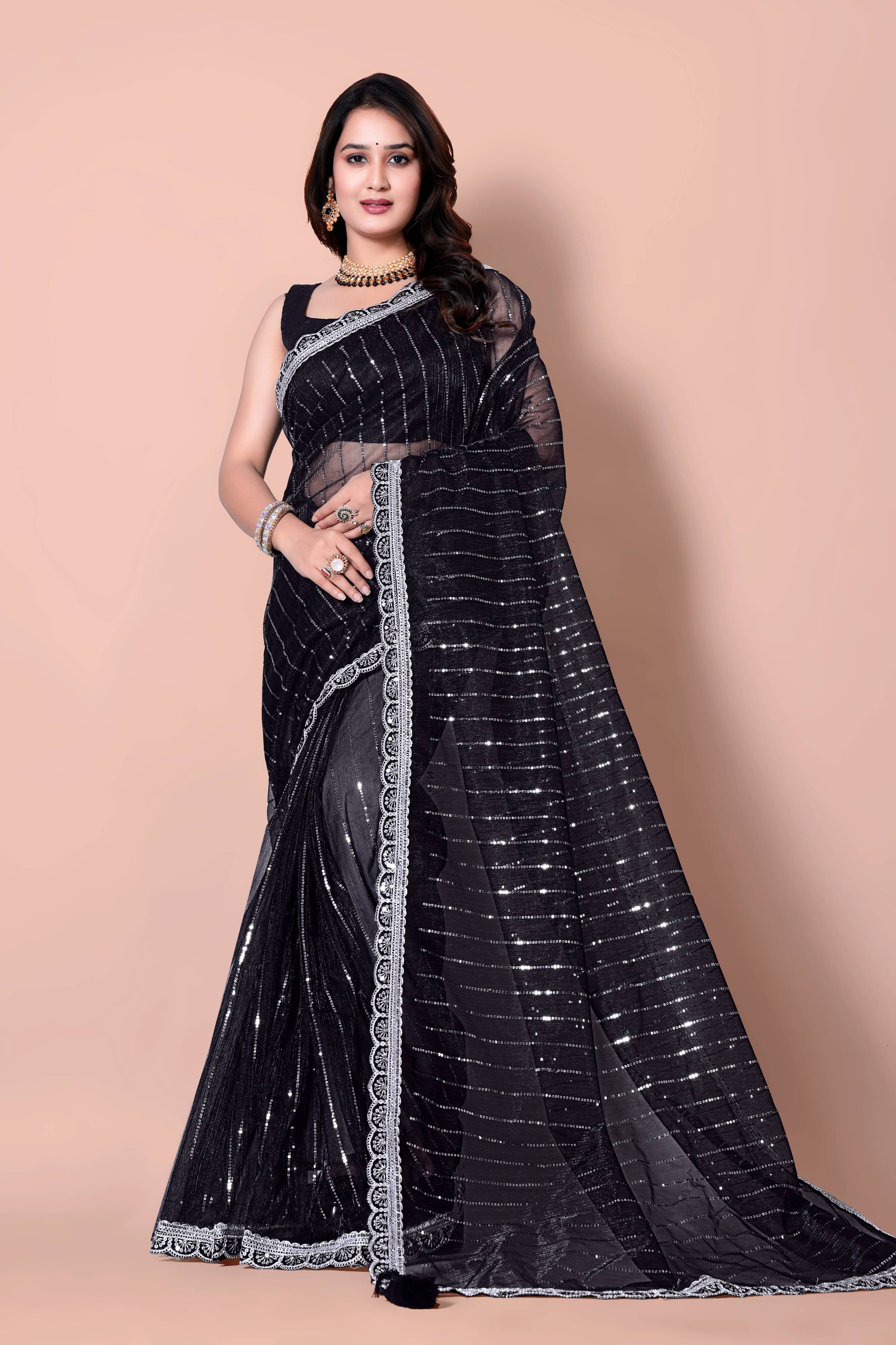 PATTARI Solid/Plain Bollywood Supernet Saree (Black)