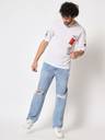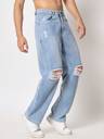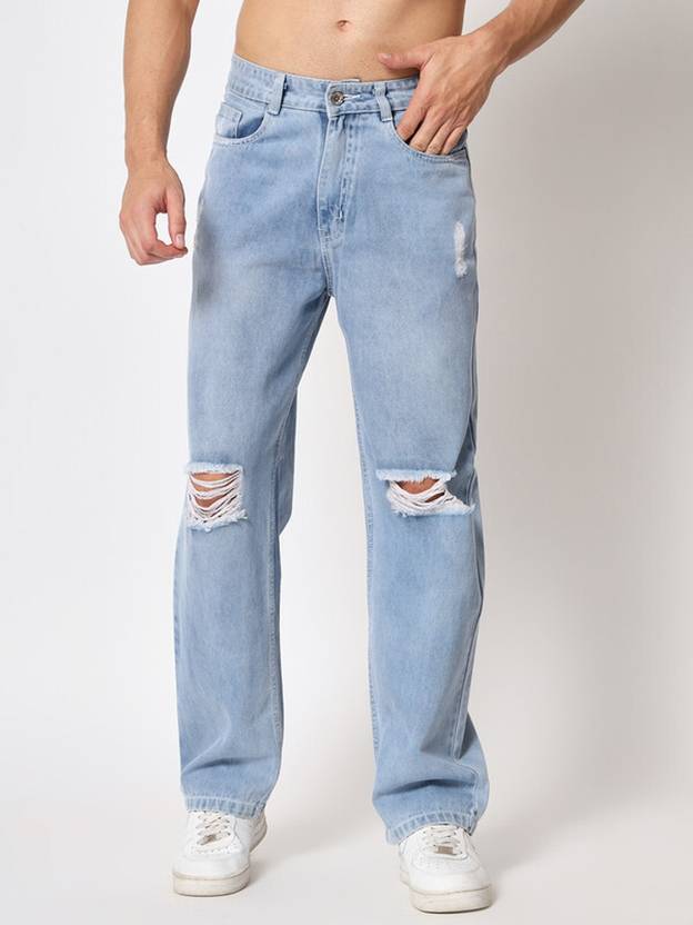 Blue straight fit distressed jeans are a popular style of denim pants that have a straight cut from hip to ankle, creating a sleek and modern silhouette. The jeans are typically made from a durable cotton material and are dyed in a deep blue color, often with subtle fading or whiskering effects for added visual interest.