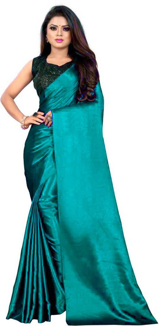 PCDESIGNER Solid/Plain Bollywood Satin Saree (Light Blue)