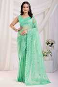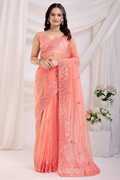 Peach colored saree is made from twill net fabric which is highlighted with beautiful sequins embroidered work as shown. Comes along with unstitched twill net blouse piece which you can customise as per your design/style. Occasion - You can wear this saree for party, festive and functions. Note:- the actual product may differ slightly in color and design from the one illustrated in the images when compared with computer or mobile screen.