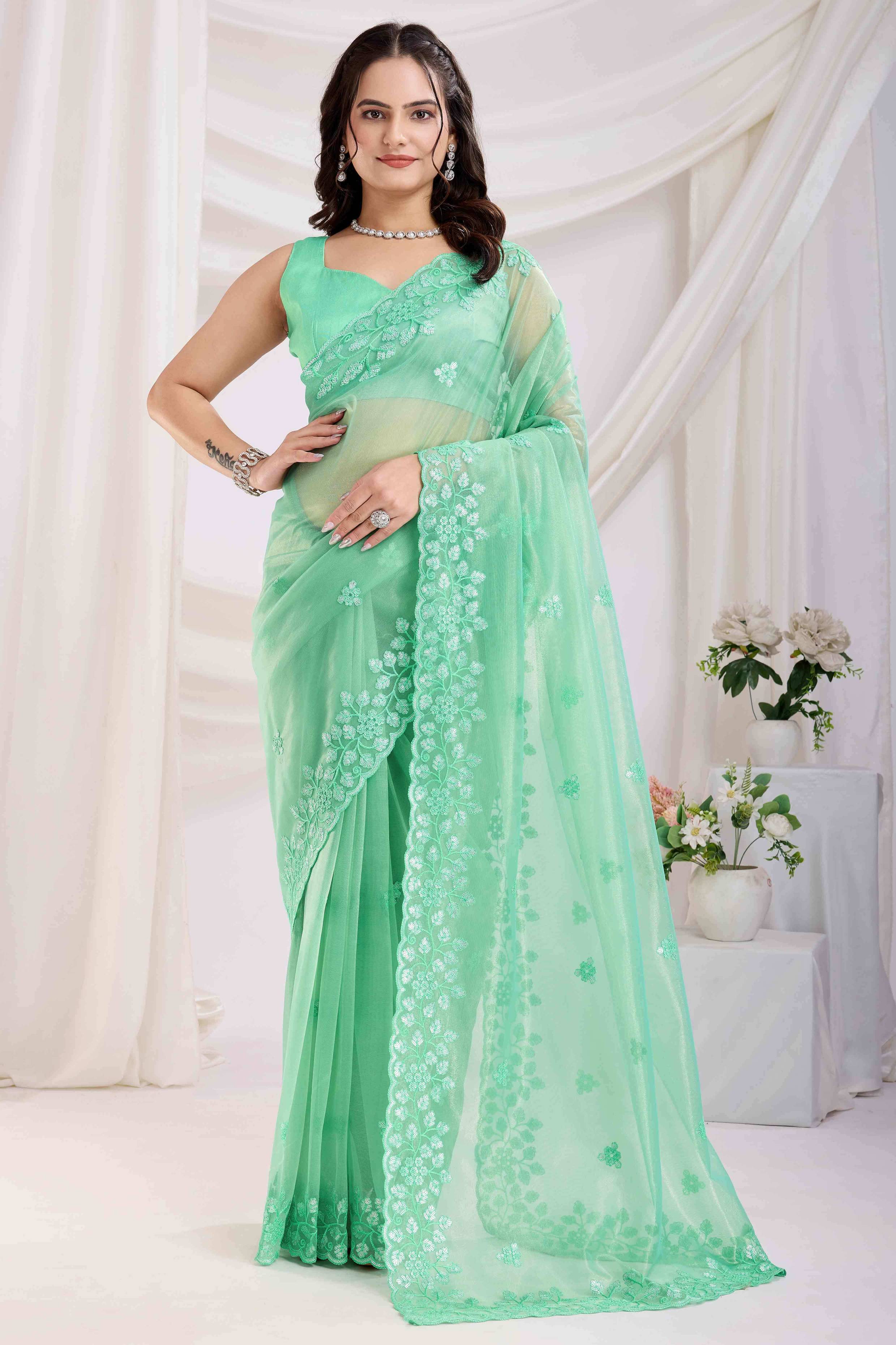 Sea Green colored saree is made from twill net fabric which is highlighted with beautiful sequins embroidered work as shown. Comes along with unstitched twill net blouse piece which you can customise as per your design/style. Occasion - You can wear this saree for party, festive and functions. Note:- the actual product may differ slightly in color and design from the one illustrated in the images when compared with computer or mobile screen.