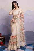 Off White colored style saree is made from net fabric which is highlighted floral embroidered as shown comes along unstitched georgette blouse piece which you can customize as per your design/style. Occasion - You can wear this saree for party and festive. Note:- The actual product may differ slightly in color and design from the one illustrated in the images when compared with computer or mobile screen.