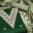 Green colored suit is prettified with floral embroidered work as shown which makes it appear classy. This top is made of vichitra silk fabric which is accompanied with santoon bottom and embroidered vichitra silk dupatta. Women can buy this suit to wear for their festive and functions. Note:- The actual product may differ slightly in color and design from the one illustrated in the images when compared with computer or mobile screen.