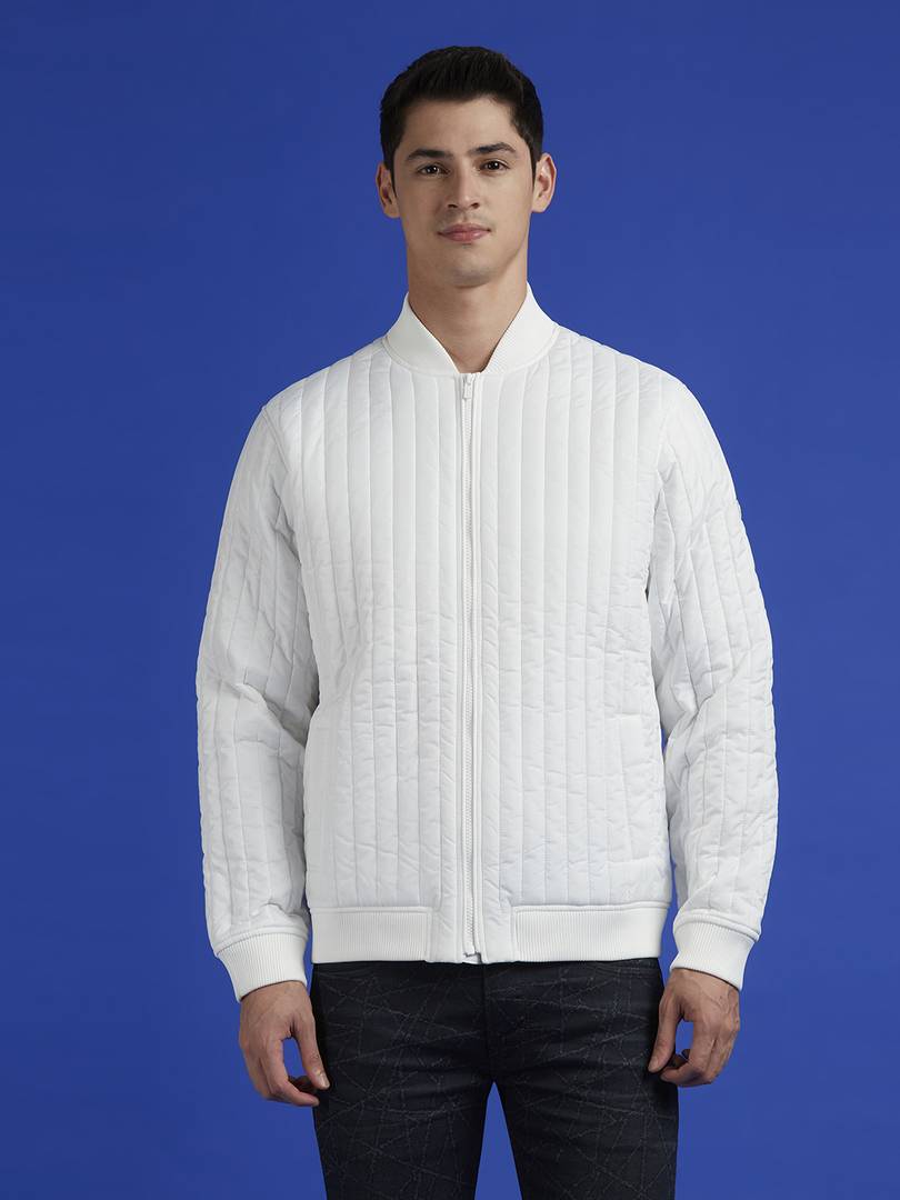 Navigate winters with style by wearing this sophisticated white bomber jacket for men. Made from durable nylon, it's built to last while keeping you on-trend. The vertical quilting serves a dual purpose - creating a sleek visual appeal while boosting the jacket's insulation properties. What sets this piece apart is the unique embroidery details that add a personalised flair that's sure to catch the eye. A subtle silicon branding on the sleeve complements the overall modern aesthetic. The high neck and zip closure offer adjustable protection against the elements. Two slit pockets provide practical storage for your everyday essentials. Team this men's jacket with dark wash jeans and clean, minimalist sneakers for a cosy, urban look.