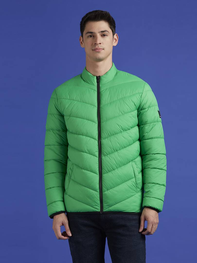 Experience the perfect combination of comfort and style with this green jacket for men. Made from nylon fabric, it offers optimum protection against the elements. Additionally, the 3M Thinsulate insulation ensures optimal warmth in harsh winter conditions. The silicon branding on the sleeve offers a unique touch. This medium-wadded bomber jacket features a high neck and full sleeves for added coverage and a zip closure for a snug fit. Moreover, two slit pockets provide ample space to keep your hands warm. Pair this men's jacket with a T-shirt, distressed jeans, and white sneakers for a classic casual look.