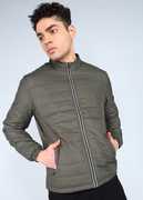 Stay warm and stylish with this olive bomber jacket for men. Crafted from durable polyester, this medium-wadded jacket offers optimal warmth without compromising on style. The high neck offers added protection against the cold. The full sleeves ensure comprehensive coverage. The three slit pockets provide convenient storage. A sleek silicon branded label adds a touch of modern sophistication. Combine this men's jacket with black jeans, a graphic tee, and Chelsea boots for a stylish urban vibe.