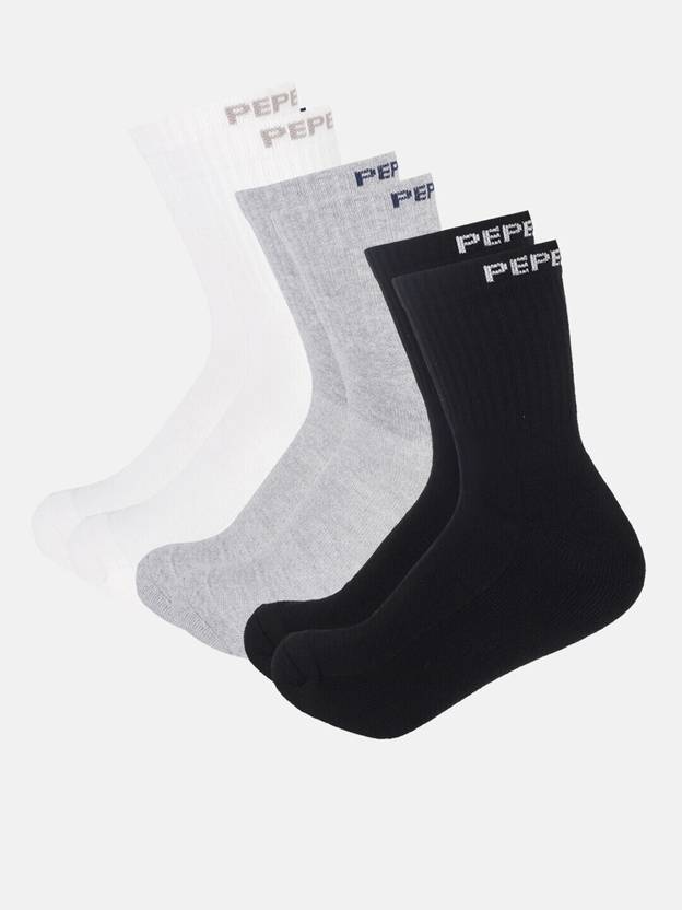 Pack of 3 white, grey and black calf-length socks, each has a ribbed mouth with flat toe seam Feature: D E S I G N: Terry Cushion at the Bottom and Breathable Fabric on Top and Mid-foot Arch Compression for Superior Fit Make It Suitable for Wide Range of Activities Including Badminton, Gym, Running, or Everyday Casual Wear Superior Sweat Absorption D U R A B I L I T Y: Premium Elastic for Superior Grip and Reinforced Heel and Toe for Enhanced Durability Optimum cushioning