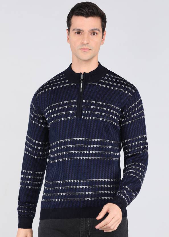 PETER ENGLAND Checkered High Neck Casual Men Blue Sweater